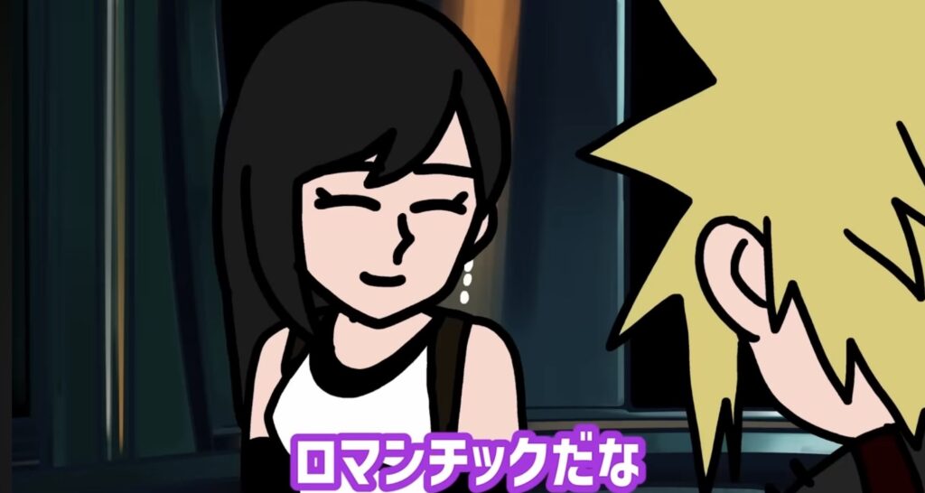 動画の始まりは、ティファが「ロマンチックだな」と呟くデートシーン。ティファはクラウドの幼なじみで、明るく社交的ながらも芯の強い性格。クラウドの不器用なうっかり発言に反応し、思わず口論が始まる場面だ。クラウドは感情を表に出すのが苦手だが、内面では仲間や大切な人を守ろうとする強さを持っている。