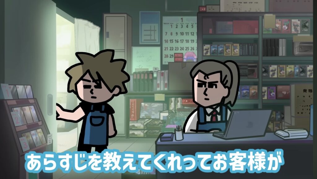 新人アルバイトが「ファイナルファンタジーVII リメイクのあらすじを教えてほしい」と客に聞かれ、店長に助けを求める──という何気ない日常シーン。