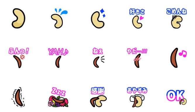 ナッツキャラクターのカシューとタネちゃんが、ゆるくて可愛いLINE絵文字として登場。小さいサイズ文字だけの会話にそっと添えることで、ほっと一息つけるアクセントに。