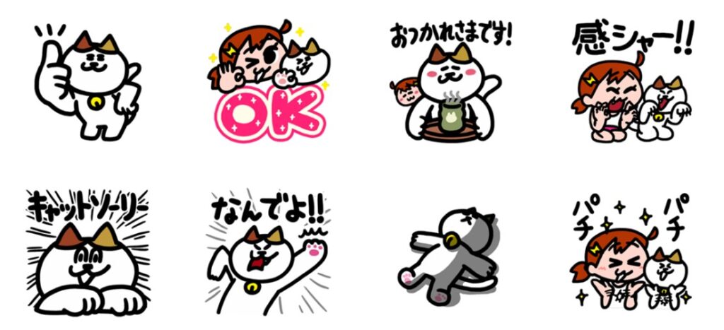ナミちゃんとミーコさんの定番スタンプは、日常の挨拶やリアクションが豊富。「おつかれさまです!」「OK」「承知です!!」といったフレーズが揃い、普段使いに最適です。