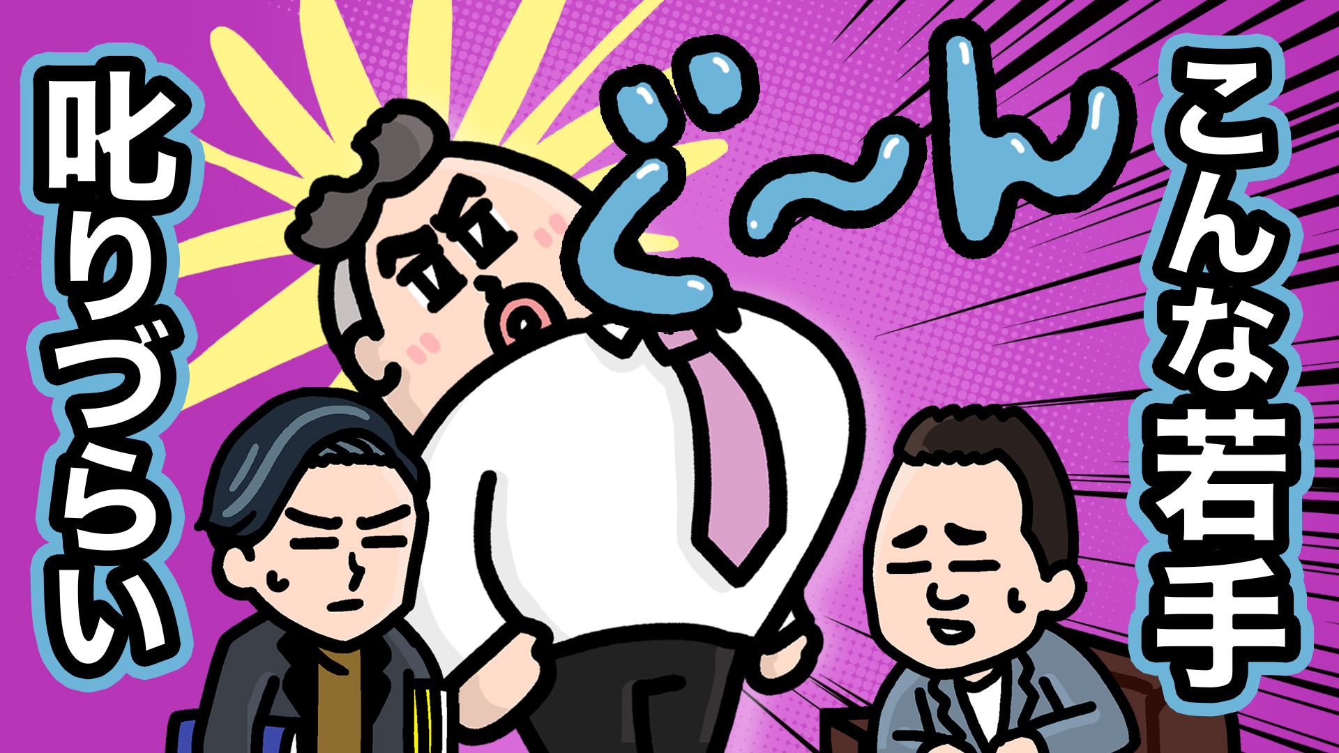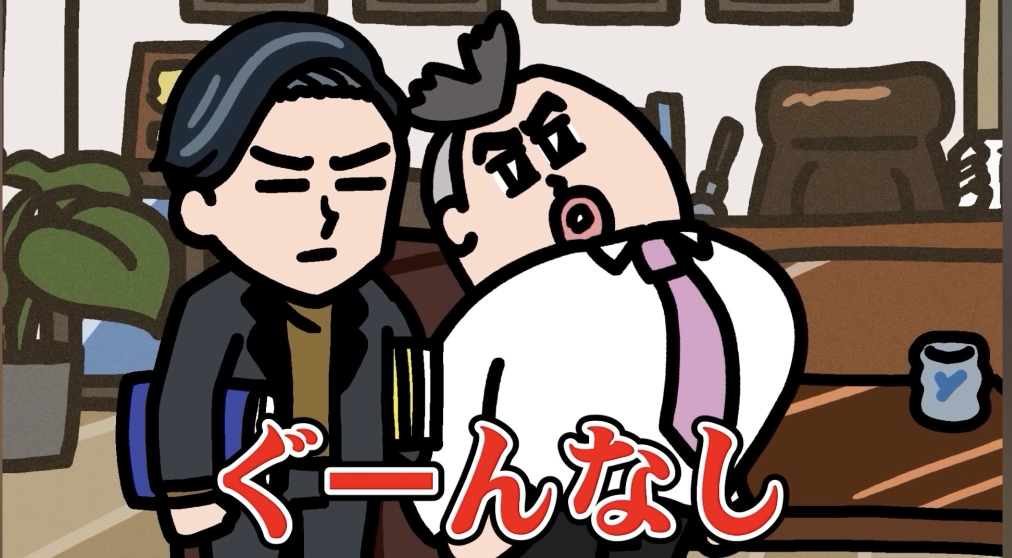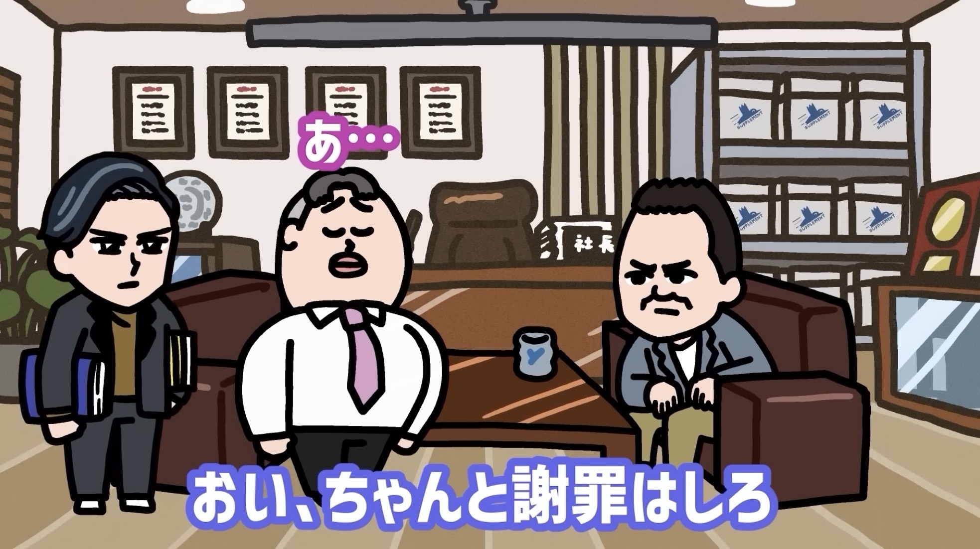 社長が担当者を厳しく叱責する一方で、担当者は自信満々に謝罪し、その態度が「ぐーん」と胸を張る姿で表現されます。