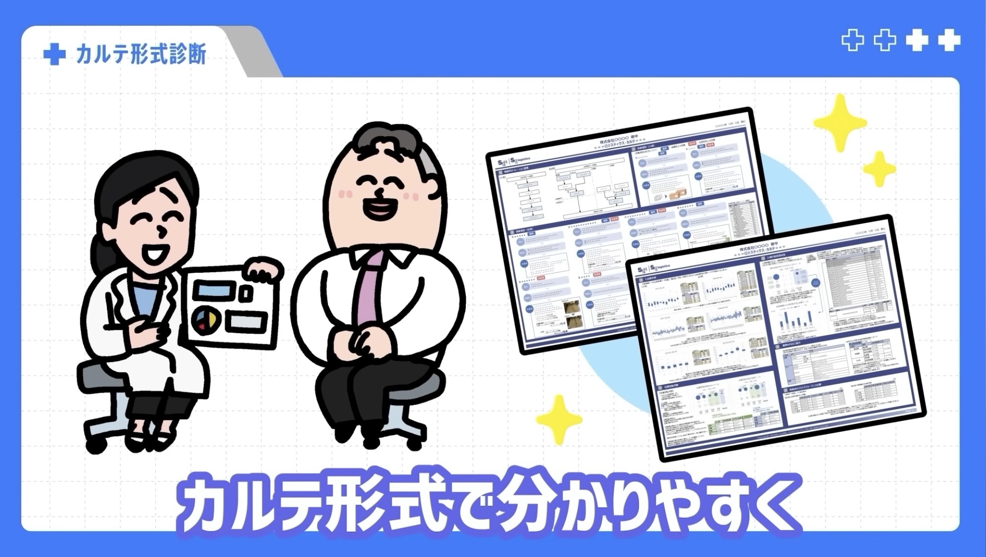 若手の自信の根拠として登場するのが、佐川GLの物流診断サービス「ロジスティクス・カルテ®」です。現場経験のあるスタッフが現場目線でサプライチェーン全体を深く分析し、その結果をカルテ形式で分かりやすく診断することで、これまで把握しきれていなかった課題や改善点が整理されていく流れが描かれます。