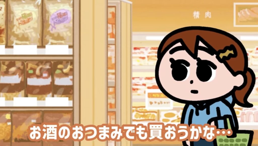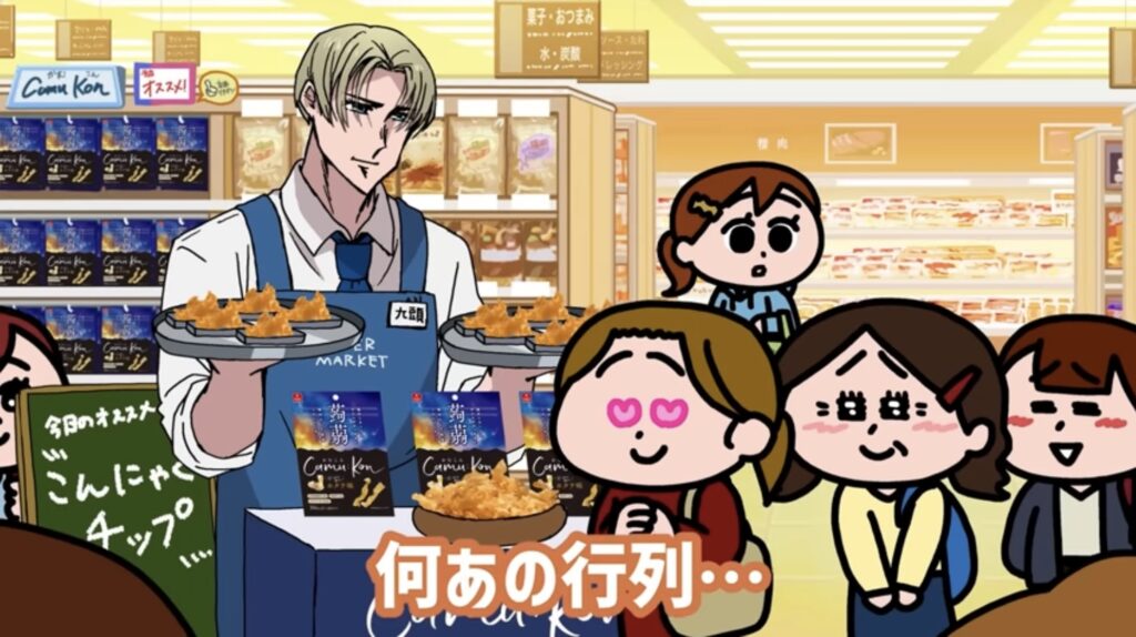 動画の舞台は、スーパーの試食コーナー。主人公の女性が「お酒のおつまみを買おうかな」と悩む場面から始まり、行列ができる試食コーナーにイケメン試食店員・九頭身(本名)が登場する。