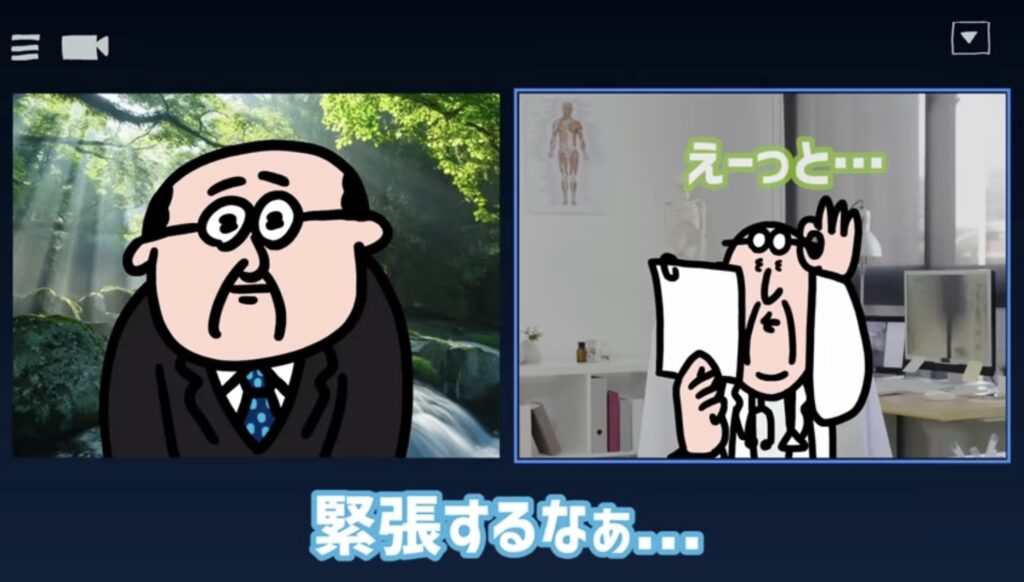 患者の鈴木が「オンライン診察初めてだから緊張するなあ……」とつぶやくと、画面越しに登場するのは常に揺れているお爺さん先生。