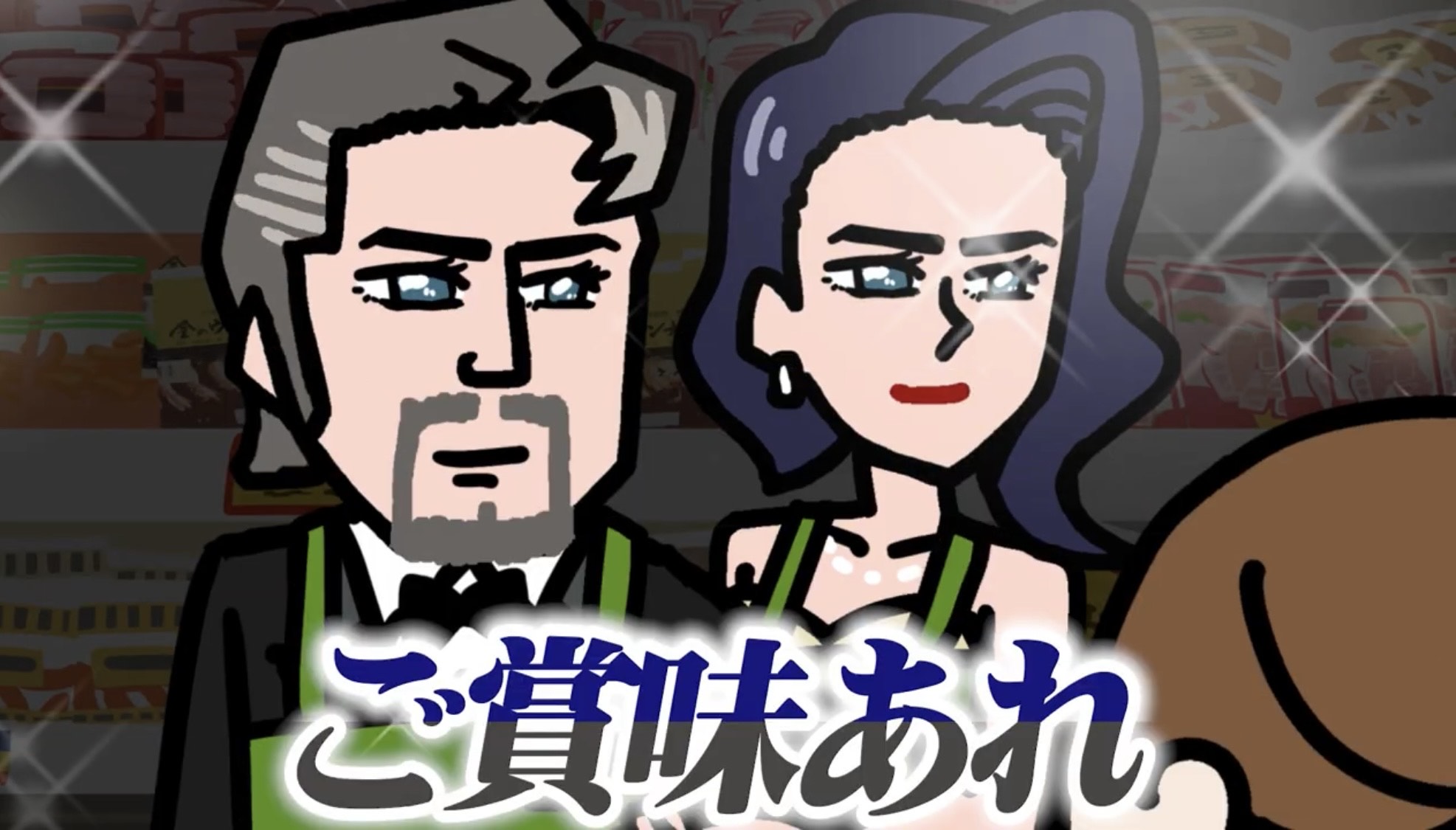 舞台は、スーパーの店頭。買い物に訪れた女性の目の前に現れるのは、“夫婦パートタイマー”ことジョージとヘレン。